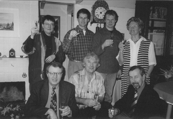 Een toast tijdens de eerste bestuursvergadering in Lichtenvoorde op 07-02-1998. l-r: Ada Somsen, Derk Somsen, Wim Somsen en Gree van Daatselaar-Somsen; l-r: Theo Somsen, Johan Somsen en Helmut Somsen.[ Click for larger image] |