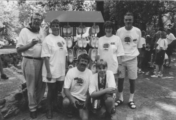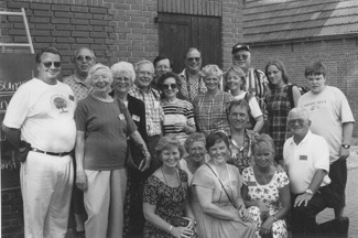 REÜNIE IMPRESSIE Ik heb het gevoel dat ik nu vlug moet zijn. Alle indrukken en emoties, ontmoetingen en gesprekken zijn overdacht en hebben een plaats gekregen. Als ik nu dat alles niet vastleg ben ik bang dat het vervluchtigt. De allesoverheersende indruk die van het hele gebeuren achterblijft is er een van diepe herkenning, van grote warmte en betrokkenheid, immense trots tot zo'n familie te mogen behoren. Het indringende gevoel van “dit maak je maar eenmaal mee” is steeds aanwezig. Dat zag je ook in de ogen, in de gezichten van veel familieleden: een intens genieten van deze specifieke gebeurtenis. Natuurlijke genegenheid was alom aanwezig. Wat doe ik nu? Ga ik een chronologische volgorde aanhouden of geef ik een totaalindruk met hier en daar saillante punten? Er is zo veel beleefd dat ik me aan de chronologie vastklamp om een beetje structuur in deze persoonlijke weergave van de reünie te brengen Vrijdagmiddag, 8 augustus 1997 Met Dick is afgesproken, via email, dat we rond 17.00 uur in Aalten bij de Watertoren zullen zijn om de bus met Amerikaanse Somsens te verwelkomen. Met die bus komen o.m. onze verre familieleden uit Utah, USA aan die bij ons te gast zullen zijn. Ruim een uur eerder meldt zich aan de telefoon een jeugdige Amerikaans/Duitse stem met de vraag ‘of zijn ouders al aangekomen zijn’. Verbazing aan onze kant. Darren Somsen informeert naar zijn ouders, Don en Susan Somsen uit Utah. Leuk! Een begin van een reünie gevoel wordt geboren. Darren en zijn bruid zijn uit Zuid-Duitsland komen rijden om de reünie mee te maken. Zij logeren bij Hotel Reijrink in Lievelde en ze willen graag met ons mee om Darrens ouders op te halen. Een afspraak is gauw gemaakt. Jan en ik rijden langs Reijrink en pikken Darren en Catherine op. Zij zitten nog knus een hapje te eten op het terras aan de voorzijde. Een ons welbekend plekje. Kennis gemaakt. Handen geschud en ‘Hoe spreek je jouw naam uit? Gggree?’ Na even oefenen lukt het om de scherpe g-klank tevoorschijn te brengen. Achter elkaar rijden we naar Aalten. Een kort ritje dat ons, alle ramen open, een beetje verkoeling brengt. We hebben zo gehoopt op mooi weer, velen met ons, geduimd, gesoebat, en mooi weer is het geworden. 26 tot 30 °C, strak blauwe lucht en geen zuchtje wind, het hele weekend en nog veel langer! Bij de Watertoren komt al gauw Dicks jeep er aan rijden. Met zwier parkeert hij zijn auto en, hupsakee!, komen er twee billboards te voorschijn. |