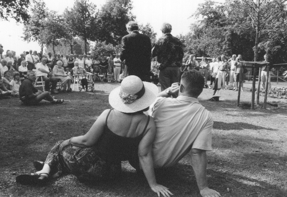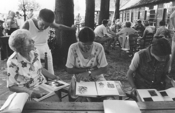 Zaterdagmiddag Een lopende lunch, binnen of buiten, in de schaduw of in de gloeiende zon, met je bordje langs de Somsen-kraampjes, het kan allemaal. Het is een heel levendig gebeuren en je vergeet haast te eten, zoveel valt er te praten en te zien. Harmien, Riekie en Ada, mijn Aaltense nichten, hebben een hele kraam gevuld met dierbaarheden uit Landstraat 7, het huis van onze Opa. De houten bureau-draaistoel ontbrak niet. Brievenboeken van uit het kantoor van de smederij, oude foto's o.a. van onze Oma, het mooiste meisje van Barlo indertijd, de oude typemachine... Ik kan er haast niet bij wegkomen. Het is alsof mijn Vader naast me staat. Hoe vaak denk ik niet vandaag. "Konden zîj dat nog es meemaken." Mijn dierbaren die er niet meer zijn. In de openingszin van deze morgen door Theo is diezelfde gedachte te beluisteren. Dat geeft een warm gevoel. ‘Wij dragen deze reünie op aan allen die er zo graag bij hadden willen zijn’. Rijk aan liefde, rijk aan trouw. Met Don en Susan zoeken we verkoeling in het Oudheidkundig Museum Erve Kots, onder de grote bomen of in de oude behuizingen.. Overal geanimeerde gesprekken, schaterend lachen, kinderen die vrolijk ronddartelen Binnen veel reünisten die bij de desks hun verwantschap laten uitzoeken of de meterslange stamboom bestuderen. Don en ik behoren tot de tiende generatie en we hebben in de tweede generatie dezelfde vader. Opmerkelijk dat je zo terug kunt gaan in de tijd met alle fantasieën die daar bij opkomen . De badges, door iedereen gedragen, werken uitsteken mee om snel contacten te leggen. "O, ben jij ook van de kouwe kant, ik ook", zegt iemand tegen Jan, lachend. Een leuk grapje, maar ook niet meer dan dat. Alle aangetrouwde Somsens horen er vanzelfsprekend evenveel bij en 't is juist boeiend om te merken met welke partners de Somsens hun leven delen. In reactie op het bovenstaande zei Jan ee: "Ik heb weinig familie en ben niet met familieband opgegroeid, maar toen ik trouwde kréég ik familie en verrassend veel." Een opmerking die me dierbaar is.