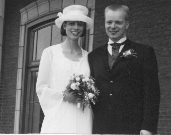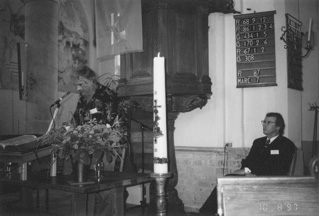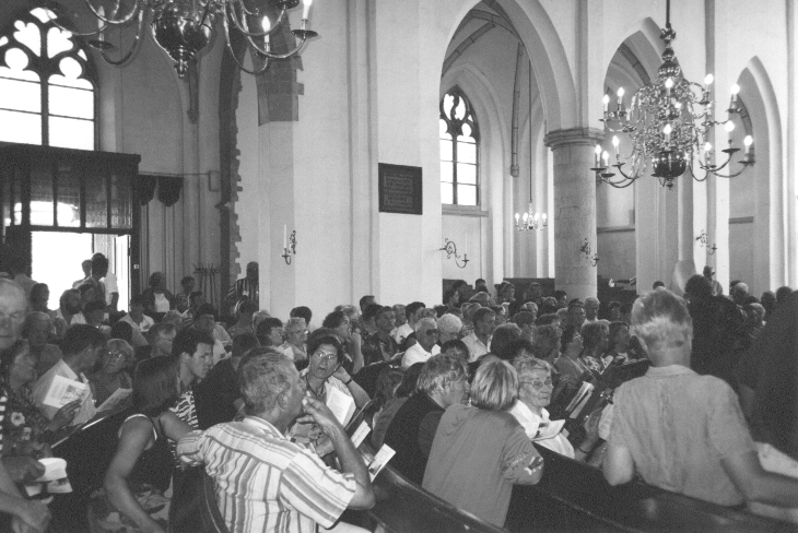 In onze tuin is het sfeervol en koel op die late avond. We kletsen nog lang samen met Ad en Aafje, die we in het donker van ons kleine dorpje nog haast kwijt raakten. ‘Half tien ontbijt morgen’ is de afspraak, daarna een wandeling . Eerst douchen en slapen nu. Maar dat lukt mij niet één twee drie. Ik zie al die mensen als in een film langskomen. Ik zie overeenkomsten in houding, lijn van de schouders, achterhoofden, haarinplant, gebaren. Prachtig is dat. Ik heb heel plezierig gesproken met een Zwitserse Somsen, iemand uit Canada, Amerikanen, Gé uit Bolnes, Jan van de Snieder en tante Lenie uit Zelhem. Met Frida en Anneke, nichtjes uit Kampen vroeger, heb ik gepraat. Velen zeiden: "‘Wat lijk je op je Moeder", en dat ervaar ik als een groot compliment. Want zij én vader hebben ons de Somsen-weg gewezen. (Daarover straks meer). Zondag, 10 augustus 1997 Een te uitvoerig ontbijt met z'n zessen doet ons nadien besluiten maar geen pannenkoek te gaan eten bij de Gulle Waard in Winterswijk. 't Zou leuk geweest zijn, maar genoeg is genoeg. Vier van ons gaan een lange wandeling maken in de omgeving van Lichtenvoorde. Don en Susan geníeten van de landelijke schoonheid. Aaf en ik duiken de keuken in. We treffen voorbereidingen voor het zondagavond diner, we gaan immers weer de hele dag weg. Menu: Soep vooraf, Salade Niçoise met warm stokbrood. Taart als dessert. Dan kunnen we nu wel weer de voordeur dicht trekken. Tegen 14.00 uur lopen we de treden op van de St. Helenakerk in Aalten voor de feestelijke Herdenkingsbijeenkomst. Een welkomstgroet met een nostalgisch tintje, zo ervaar ik de vriendelijke gestalte bij de ingang die ons een grote mand uitnodigend voor houdt. In die mand kleine éénpersoons zakjes... met pepermuntjes! ‘Het calvinistisch volksvoedsel’ van weleer. Hoe iedere geste doordacht is... De oude kerk omarmt je als het ware door zijn ronde vorm. Geroezemoes van stemmen, een groet, een zwaai. Is het een Mokum, voelt het als thuiskomen? "Vertellingen, historie, muziek en zang", staat er eenvoudig in het programma. Maar hoe moet ik de sfeer beschrijven die daar groeit? We worden meegenomen naar lang vervlogen tijden, de tijden van de vroegere pachtboeren die veel horigheid verschuldigd waren aan de Heren van de naburige kastelen. Meegenomen naar de tijd dat onze Lage Landen katholiek waren, tot aan de Reformatie. Voor Nederlanders is dat bekend, daar zijn we mee opgegroeid, met de 80-jarige oorlog, met Luther, Calvijn en Zwingli. Maar voor de Amerikanen onder ons is het een tikje schokkend om te hor. "Zijn wij van katholieke afkomst? Wás dat vroeger zo? Om het geschiedkundige verhaal te verlevendigen klonk plots devoot een Gregoriaans gezang door de kerk. Bij de Reformatie aangekomen nodigt Theo ons uit psalm 42 te zingen in het Oudnederlands en op héle noten. Er trekt een ongelovige glimlach over mijn gezicht. Het zal toch niet waar zijn? Op héle noten? Dat is toch een allang gepasseerd station? Maar hoor! Daar klinken al de gedragen tonen van het kerkorgel door Dick bespeeld. |