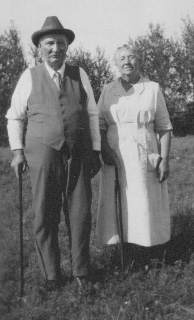 Vader was 25 jaar en moeder 17 jaar toen zij op 2 september 1873 trouwden. Ik weet zeker dat hij ten langen leste een geliefde had gevonden met wie hij kon kibbelen en plagen. Ik herinner me dat hij eens tegen Mam zei, dat ze naar de pomp kon lopen. In het begin van hun huwelijk woonden ze in Lime Springs, Iowa, waar vader -vermoed ik- werkte in de winkel van Oom Gerritt (Gerrit Jan Somsen --1842-1912- een oudere broer van Arent Jan). Hun eerste twee zonen werden in Lime Springs geboren: 'Kleine Aaron' en Levi. Aaron stierf als baby. De volgende drie kinderen, waaronder weer een Aaron, werden geboren op de boerderij in Fillmore, Minnesota. Arent Jan Somsen [P753] enAntonia Grooteboer [P754] - Foto t.g.v. hun 50-jarig huwelijk, 02-09-1923 Later verhuisde het gezin weer terug naar Lime Springs, waar de rest van de veertien kinderen geboren werd. Ik was het tiende kind: Josephine Henrietta, geboren in 1890. Ik denk dat vader en Oom Gerritt in Lime Springs een maatschap vormden en de winkel samen hadden. Maar voorzover ik me herinner was het opschrift boven de winkel altijd: ‘John Somsen’. Rond 1898 verhuisde een deel van ons gezin naar de boerderij in Fillmore, MI die tot zolang verpacht was geweest. De oudste drie broers verzorgden de boerderij en twee oudere zusters van mij deden de huishouding.Ik heb de prachtigste herinneringen aan mijn lange logeerpartijen daar! In 1903 verhuisde de hele familie naar Dakota. Het oorspronkelijke winkelgebouw in Lime Springs was door brand verwoest en daarna gebeurde hetzelfde met het gebouw waarin de zaak werd voortgezet. Een ramp voor de familie. De eerste drie jaren in Dakota waren zeer zwaar. Droogte vernielde de oogsten. Het hele gezin werkte keihard. Vader zaaide elk jaar koren. Eigenlijk werd er door te weinig mensen koren gezaaid. Het klimaat was ook niet overwegend gunstig voor akkerbouw. Toch genoten wij in die jaren allemaal van de fijne, vrolijke, lange zomers met elkaar en met nichtjes en neven . Begin 1930 werden de landbouwwerktuigen, de voorraad en alles wat daarbij hoorde verkocht.