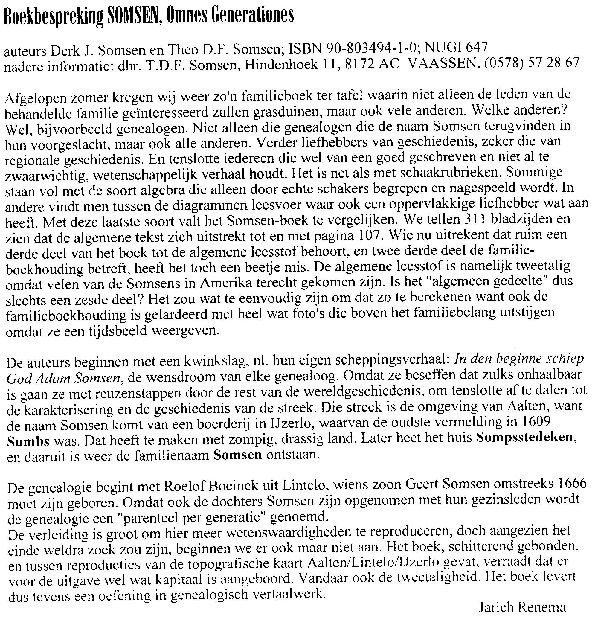 In het Oostgelders Tijdschrift voor Genealogie en Boerderijonderzoek (O.T.G.B.) van februari 1998 troffen wij een positief gestemde boekbespreking aan van ons familieboek Somsen Omnes Generationes.